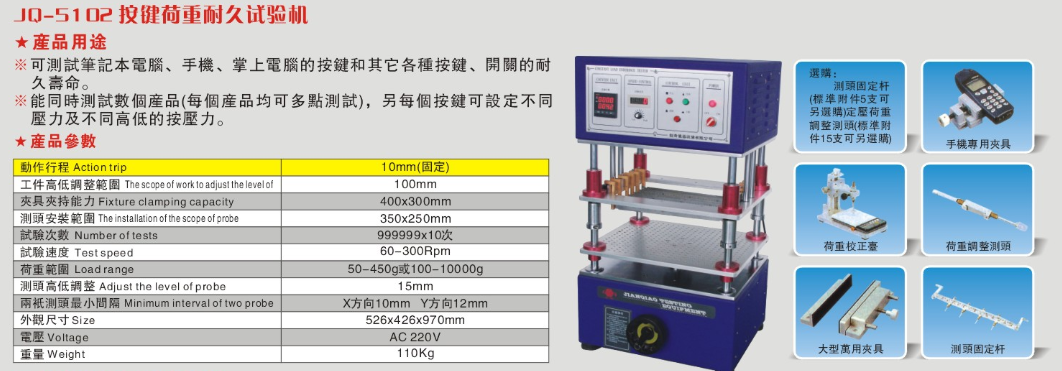 用途:一、產品介紹: 本機器適用于各種按鍵及開關之(荷重-行程)曲線測試,利用WINDOWS中文視窗畫面設定,操作簡單方便,且所有資料皆可儲存(試驗條件、荷重曲線圖、 測試結果、檢查