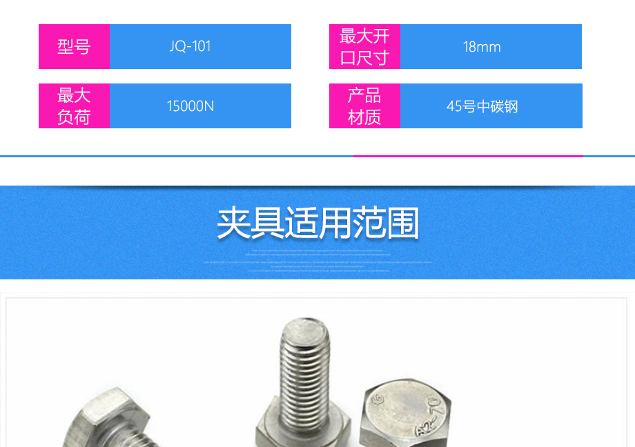 產品型號:JQ-101 品牌:劍 喬 用途:螺栓拉伸夾具適用范圍:螺釘螺栓等材料的拉力,破壞力測試。